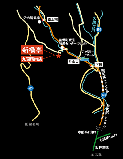 < お車の場合 >京都縦貫自動車「亀岡IC」から国道372号線、府道 731号線、国道477号線、府道732号線、府道54号 線、国道173号線を経由 能勢町観光物産センターから約300m